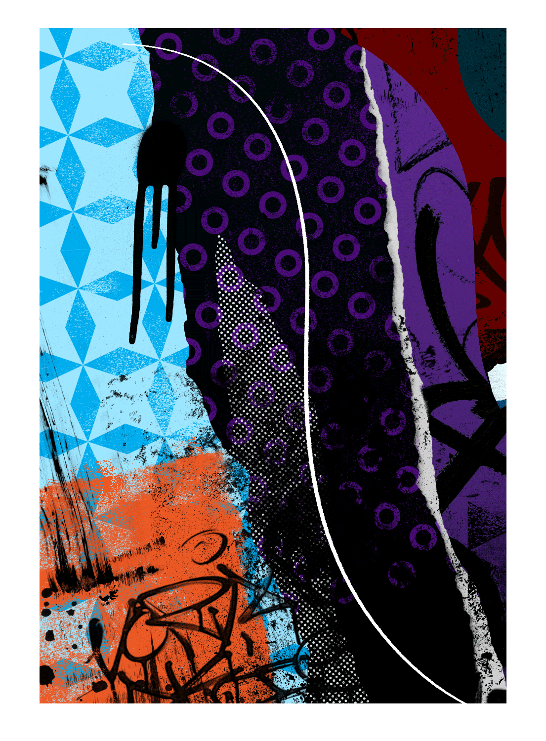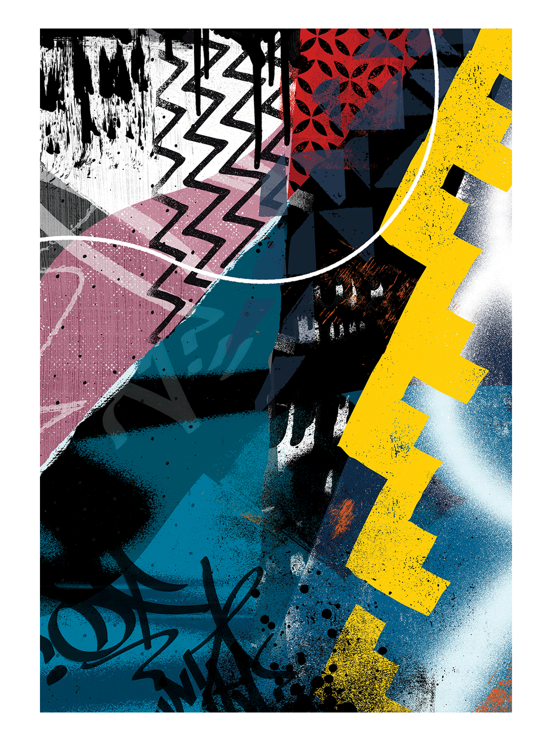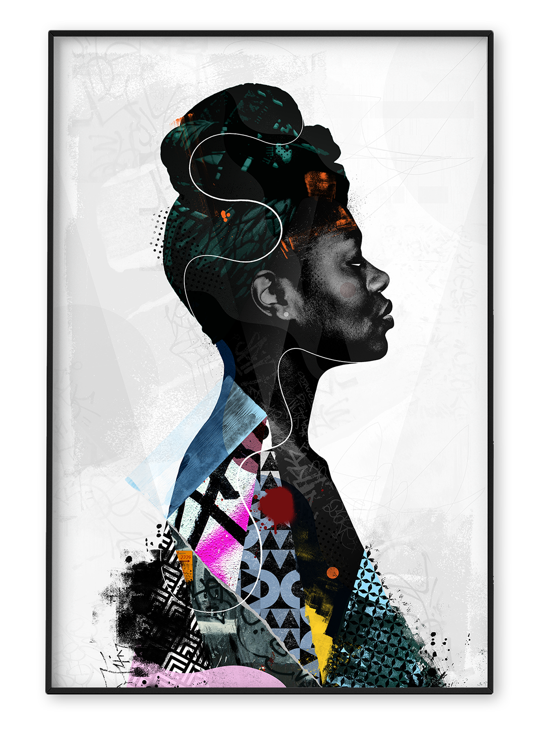 HAND PAINTED TEXTURES, ILLUSTRATED PATTERNING, DISTRESSED GRAFFITI BLEND WITH RICH COLOURS TO FORM THESE INTRICATE PORTRAITS. THE SCALE OF THE WORK ADDS TO THE OVERALL IMPACT OF THESE UNIQUE PIECES.